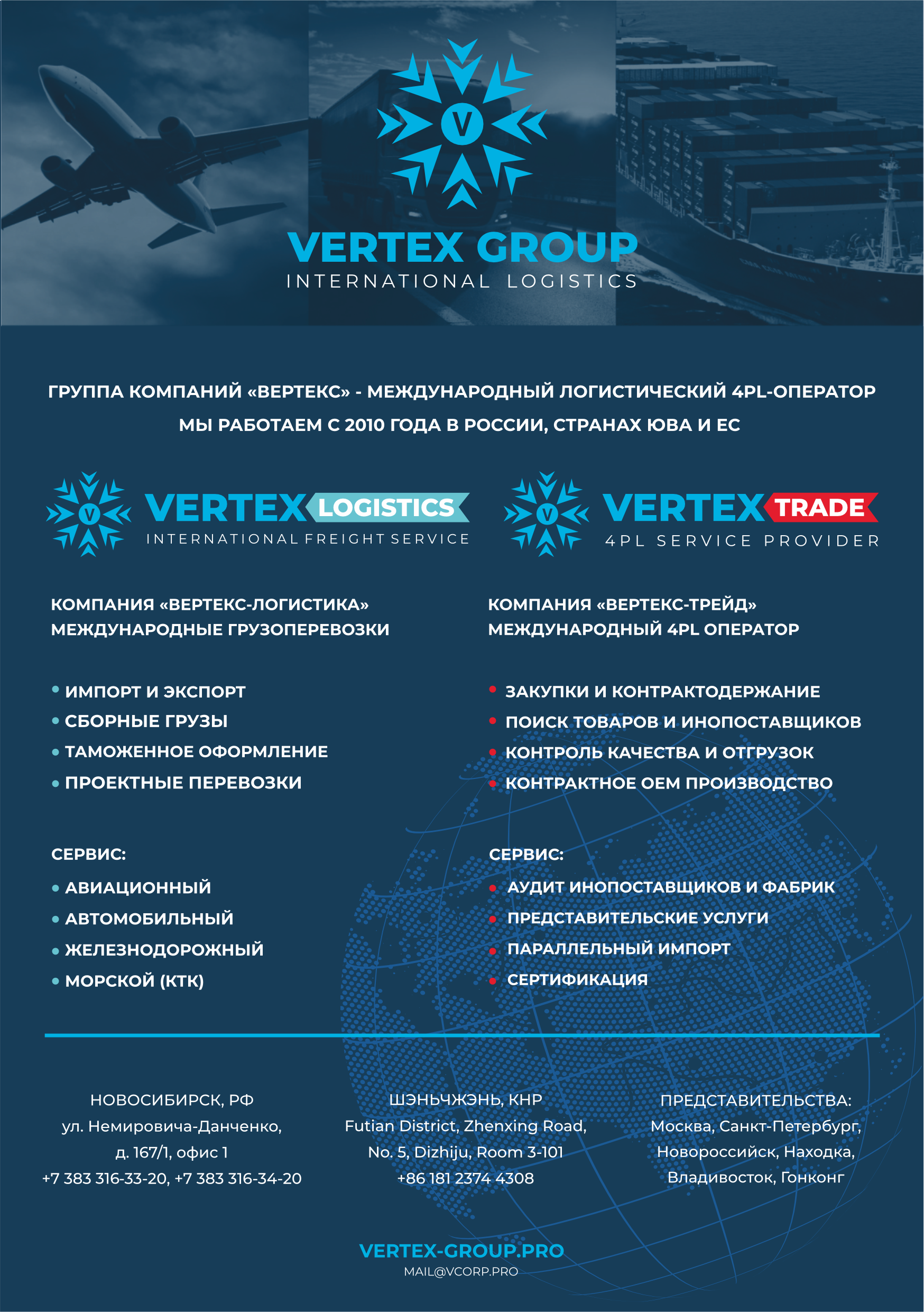 - Многолетний опыт – с 2010 года компания совершенствуется и профессионально оказывает услуги в сфере международной комплексной логистики на уровне 4PL-провайдера.