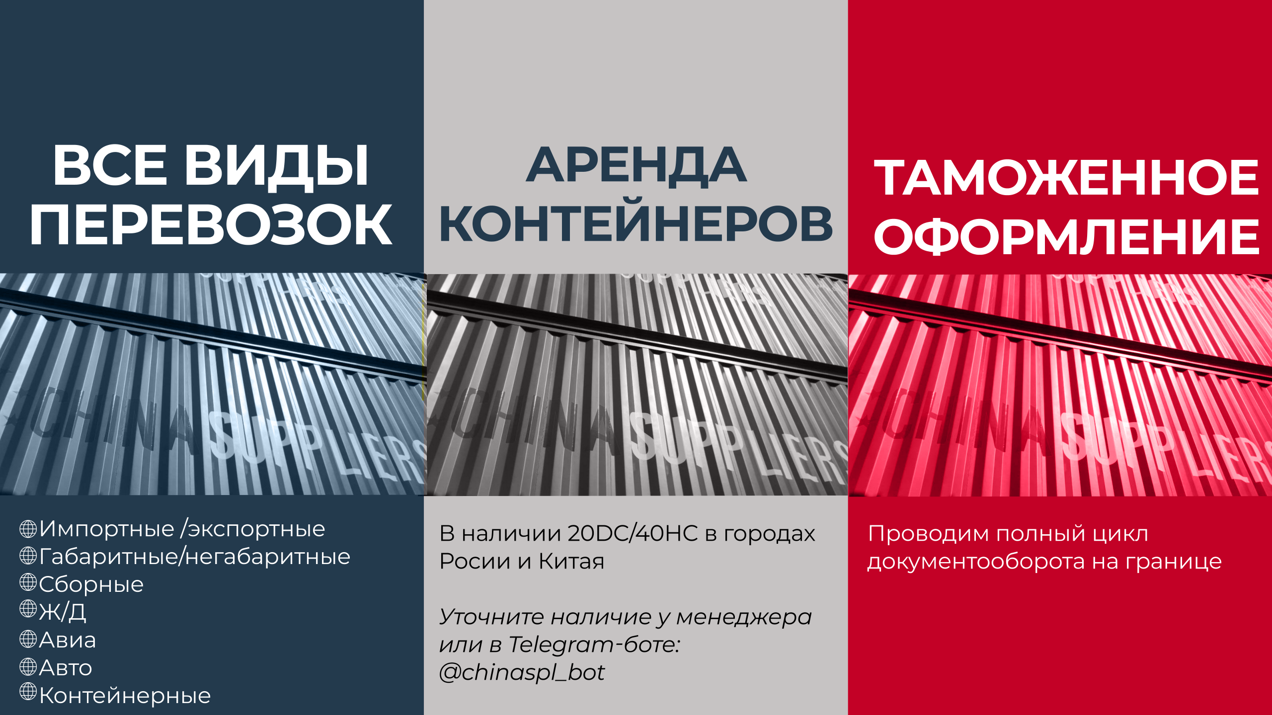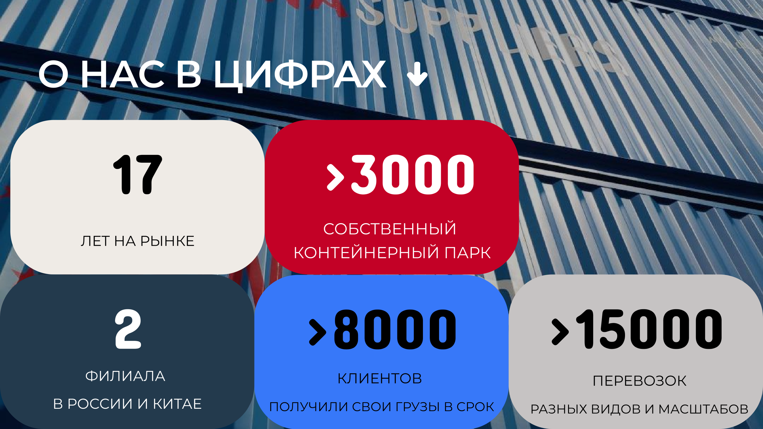 Прямые тарифы от морских линий и ЖД станций: мы предлагаем конкурентные тарифы и избегаем наценок. Мы располагаем более чем 3 000 единиц контейнеров, а также производим собственные.